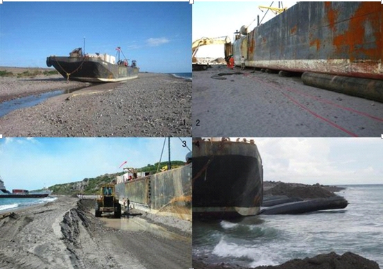 圖3:為船推出一個(gè)下水的斜坡。圖4:使用拖船與氣囊使船重**中