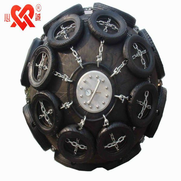 在球體用若干個橡膠輪胎捆綁在球體上,防止護舷表面被金屬突起物劃傷,可延長護舷使用壽命。通常與鏈條相連接。